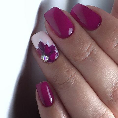 Как вариант – сделайте ярко-розовый маникюр, а один ноготь украсьте изображением цветка, серединку которого можно декорировать небольшим камнем.