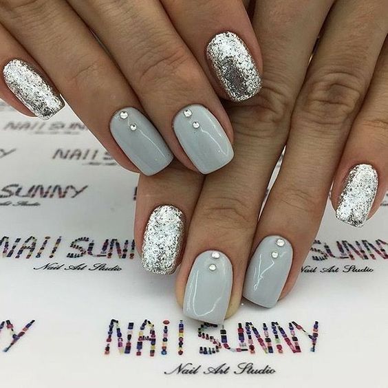 Также можно покрыть несколько ногтей серым гель-лаком, а остальные – насыщенным серебристым с блестками. А дополнят такой дизайн неброские камешки.