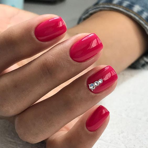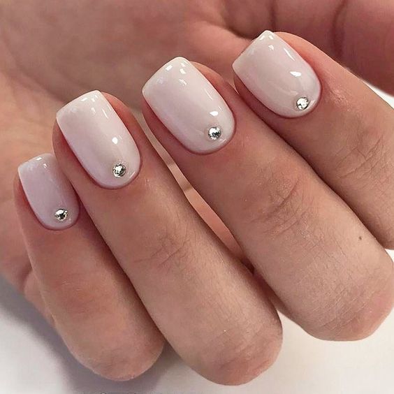 Если вы любите сдержанный однотонный маникюр, можно покрыть ногти телесным оттенком или, как его еще называют, нюдовым, а основание каждого украсить небольшим камешком. Будет выглядеть очень сдержанно, но в то же время стильно.