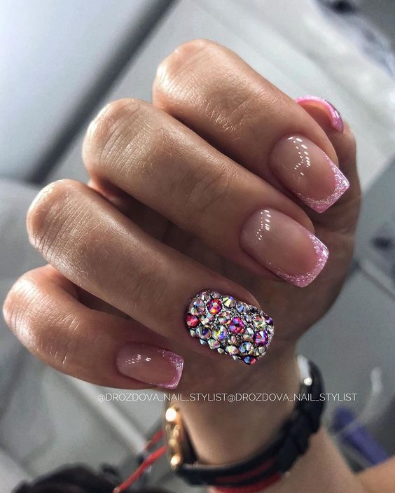 Если вы любите выделяться из толпы – сделайте необычный френч с розовым кончиком, а один ноготь полностью покройте камнями.