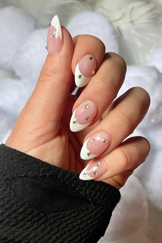 Еще один вариант – украсить камнями классический французский маникюр, когда ногтевую пластину покрывают неярким бежевым или пастельно-розовым тоном лака, а на кончик ногтя по форме полумесяца наносят белый цвет.