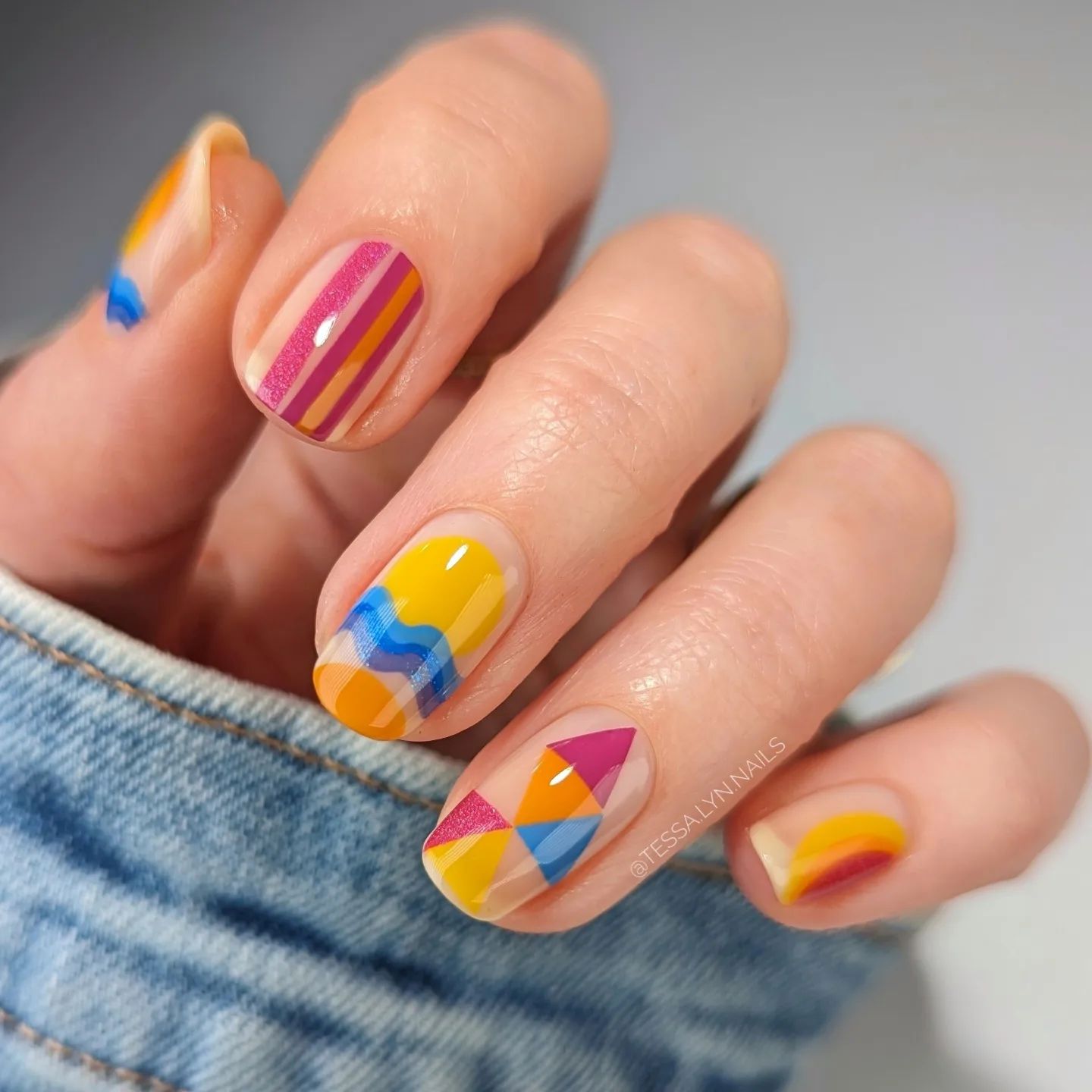 Также можно разнообразить летние образы абстрактным маникюром: для создания такого эффекта можно смешать несколько разных оттенков, геометрические фигуры и просто хаотичные линии.