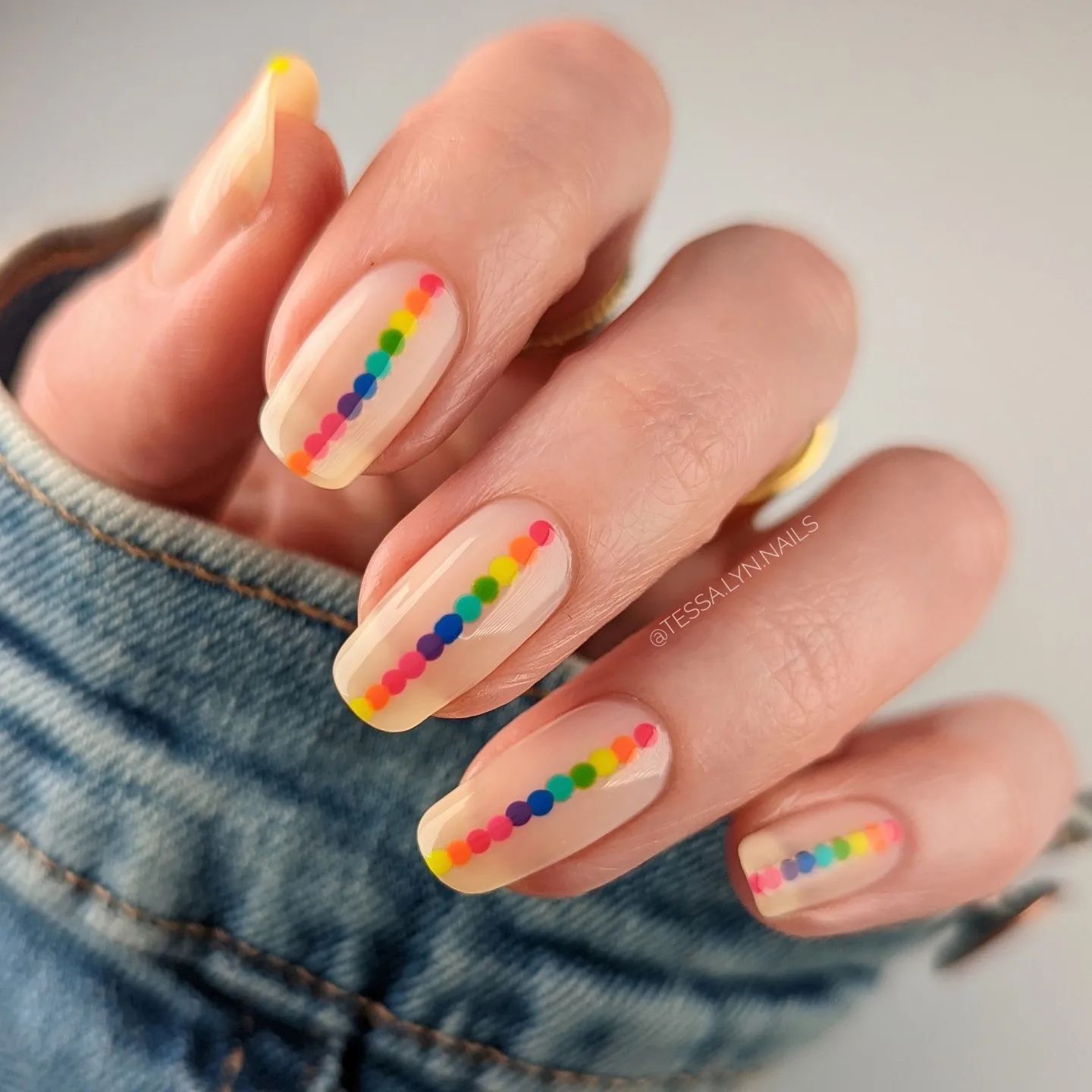 Еще один вариант дизайна на лето: покрываем ногтевую пластину полупрозрачным гель-лаком, а затем делаем дизайн с вертикальными точками разного цвета. Такой маникюр точно будет привлекать внимание окружающих.