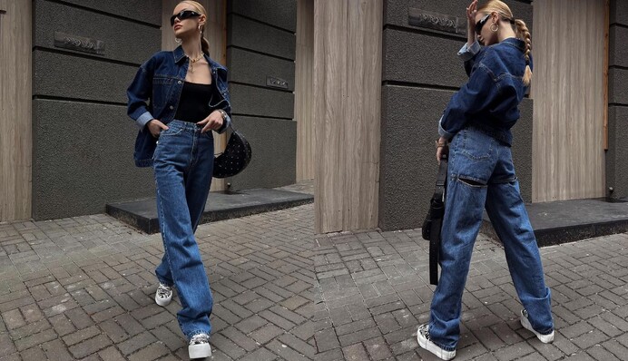 Апанасенко надела широкие джинсы с высокой линией талии классического синего цвета с черным лонгсливом. Изюминка этих брюк – кокетливые разрезы сзади на бедрах. Сверху она накинула джинсовую куртку оверсайз более насыщенного оттенка. А дополнили лук кеды на массивной платформе, кожаная сумка-бананка, солнцезащитные очки и массивное украшение на шее в виде цепи.