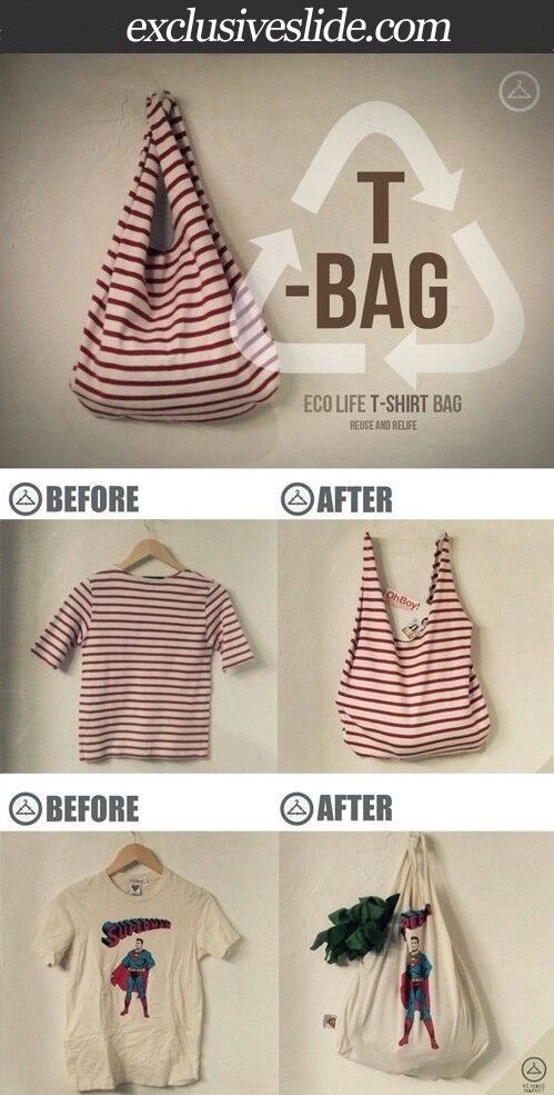 Из старых футболок можно сделать не только топы. Также вы можете изготовить стильную сумку для покупок или походов на пляж. Для этого нужно распороть футболку, убрать рукава и сшить ткань заново, формируя сумочку.