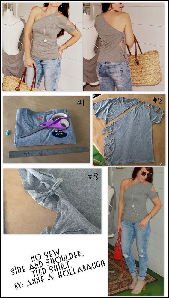 Подобный вариант, но в другом стиле - кроп-топ на завязках. Просто возьмите футболку, обрежьте ее так, как показано на рисунке ниже, и завяжите длинные кусочки ткани.