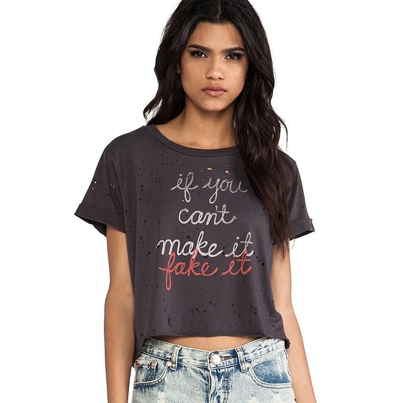Проще всего сделать модный кроп-топ. Для этого вам нужно только взять старую футболку, обрезать ее до желаемой длины и немного потянуть ткань пальцами, чтобы скрыть линию разреза. Также можно сделать на топе дырочки или бахрому.