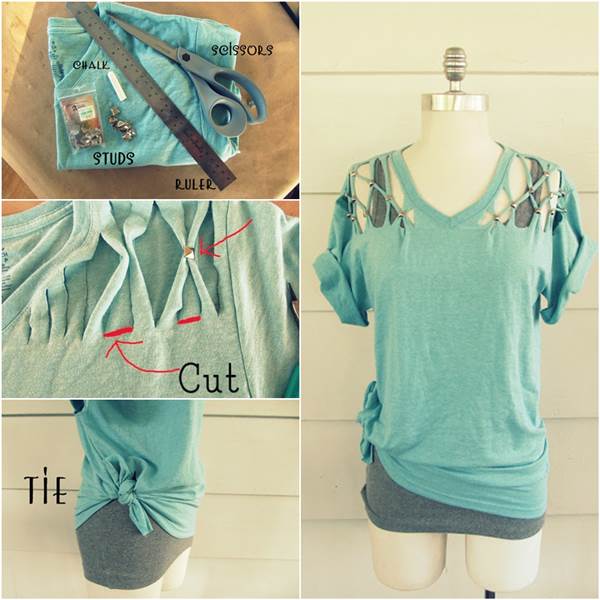Еще один интересный вариант - узоры и плетения. Вам понадобятся ножницы, футболка и железные заклепки. На рисунке ниже показано, как именно нужно разрезать и сплести ткань.