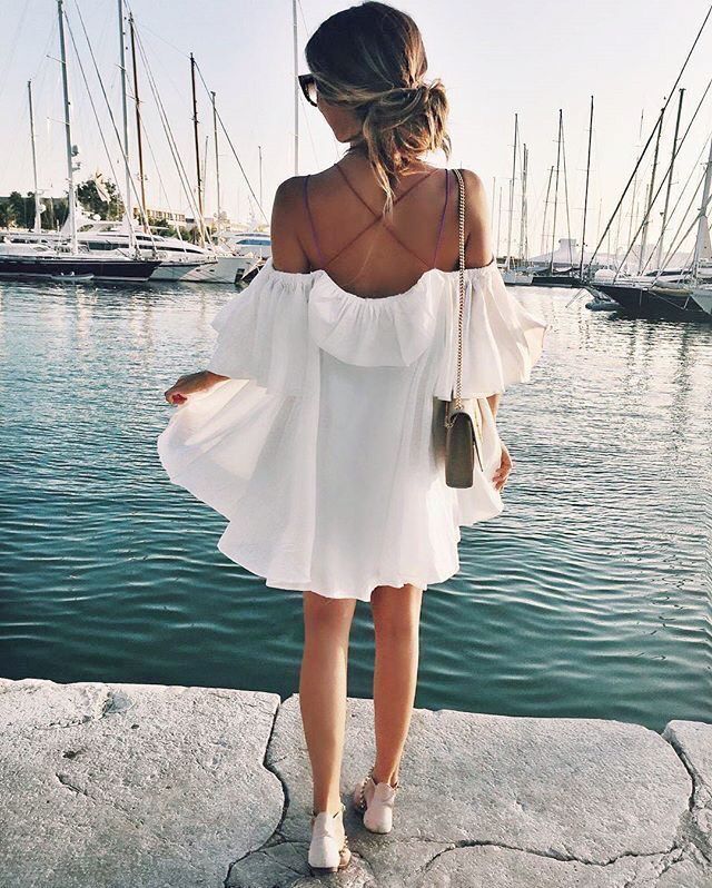 Начнем с платьев с открытыми плечами. Этот фасон стал одним из главных трендов лета 2020. Носить такое платье можно как с босоножками и кроссовками, так и с классическими туфлями.