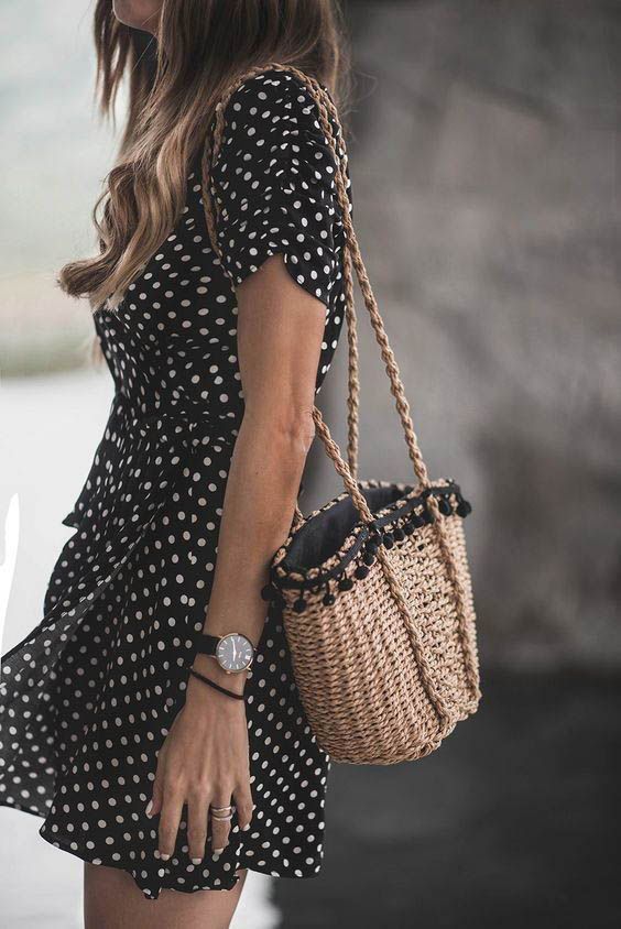 В тренде принт в горошек, поэтому платья с такой расцветкой тоже являются актуальными и модными. Носить такой наряд можно со светлыми кроссовками или с лодочками на небольшом каблуке.