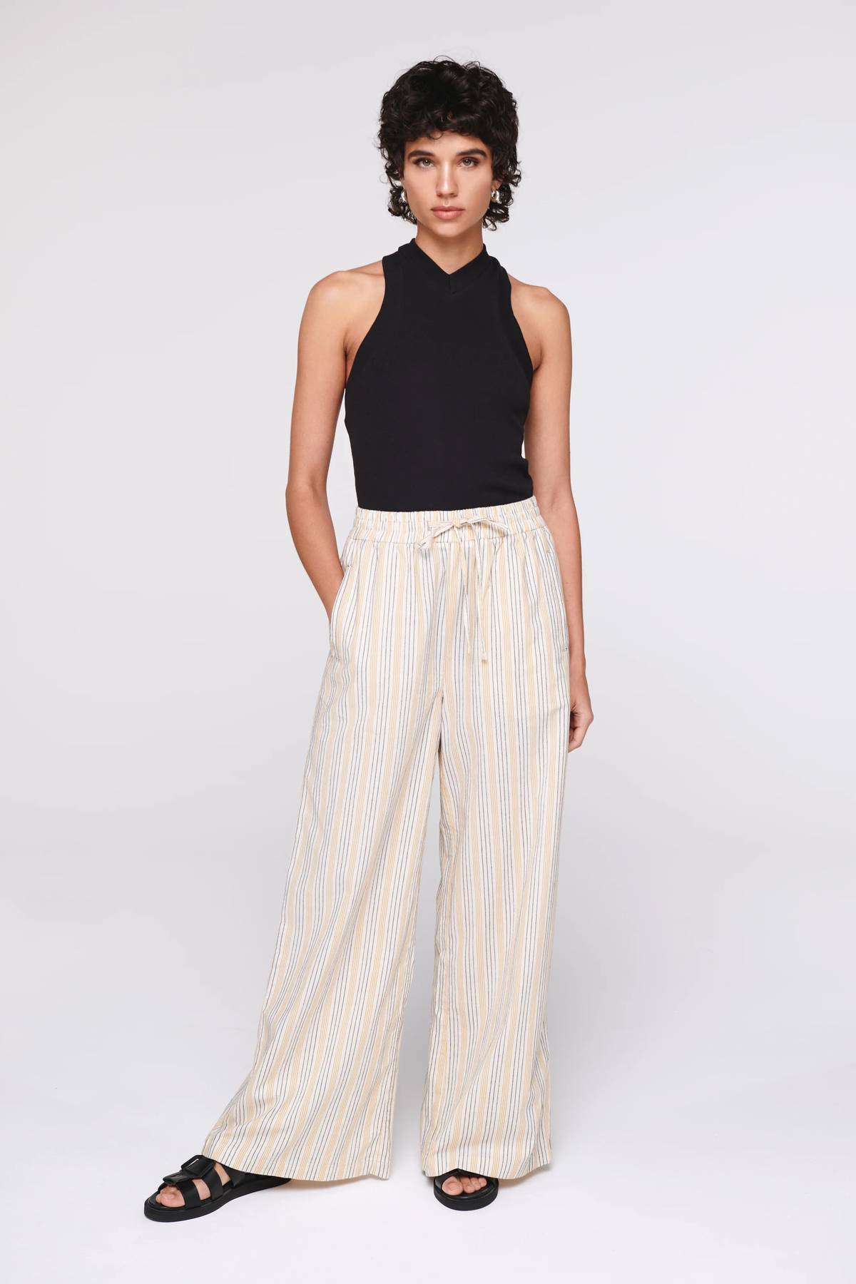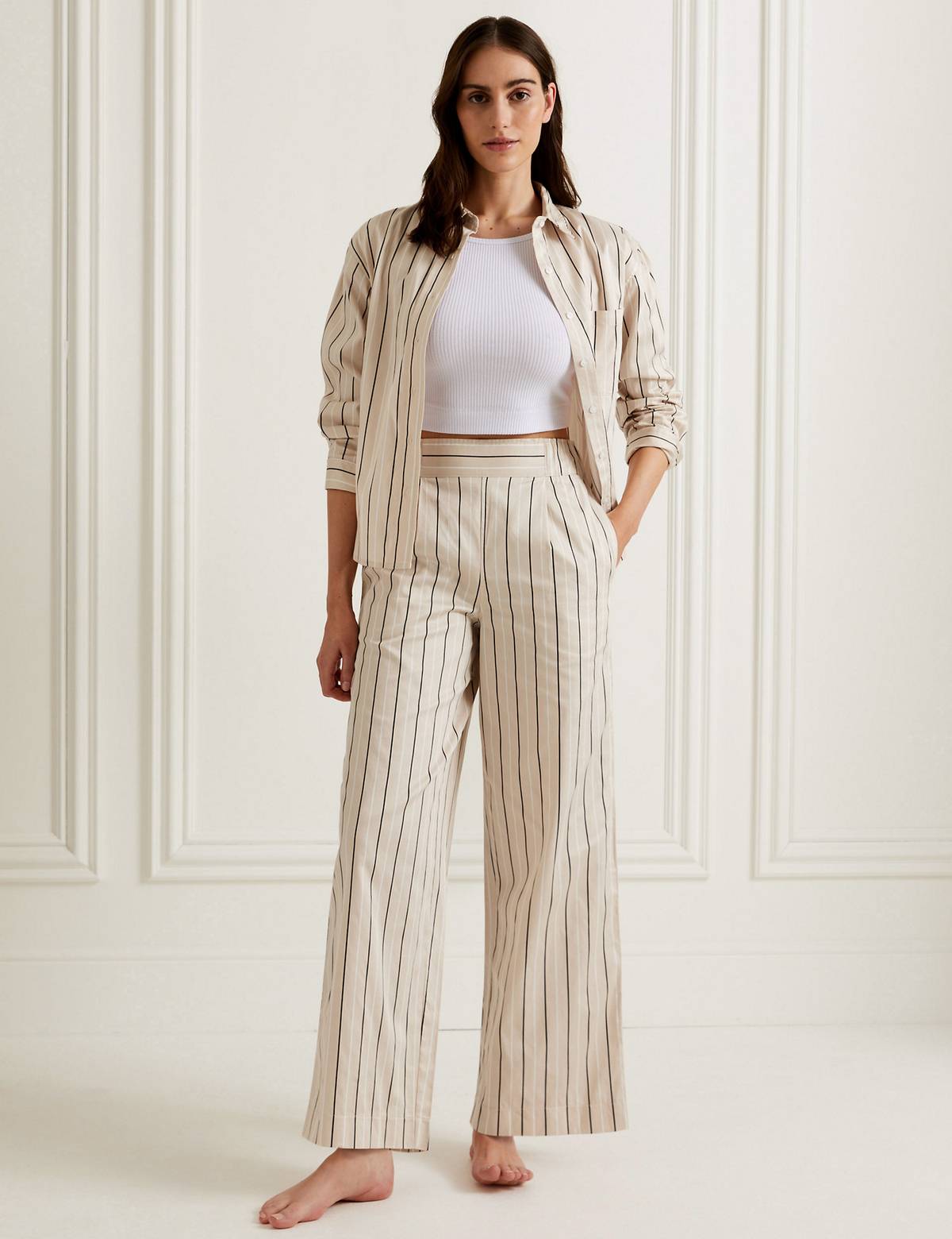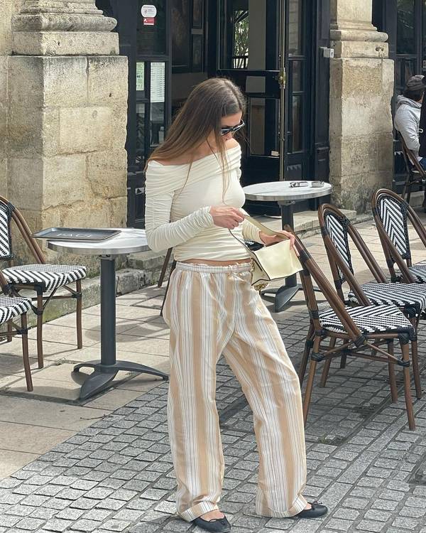 Для расслабленного лука выходного дня надевайте пижамные штаны в бежевую полоску и такого же оттенка лонгслив с открытыми плечами. Дополните образ небольшим клатчем и черными трендовыми балетками.