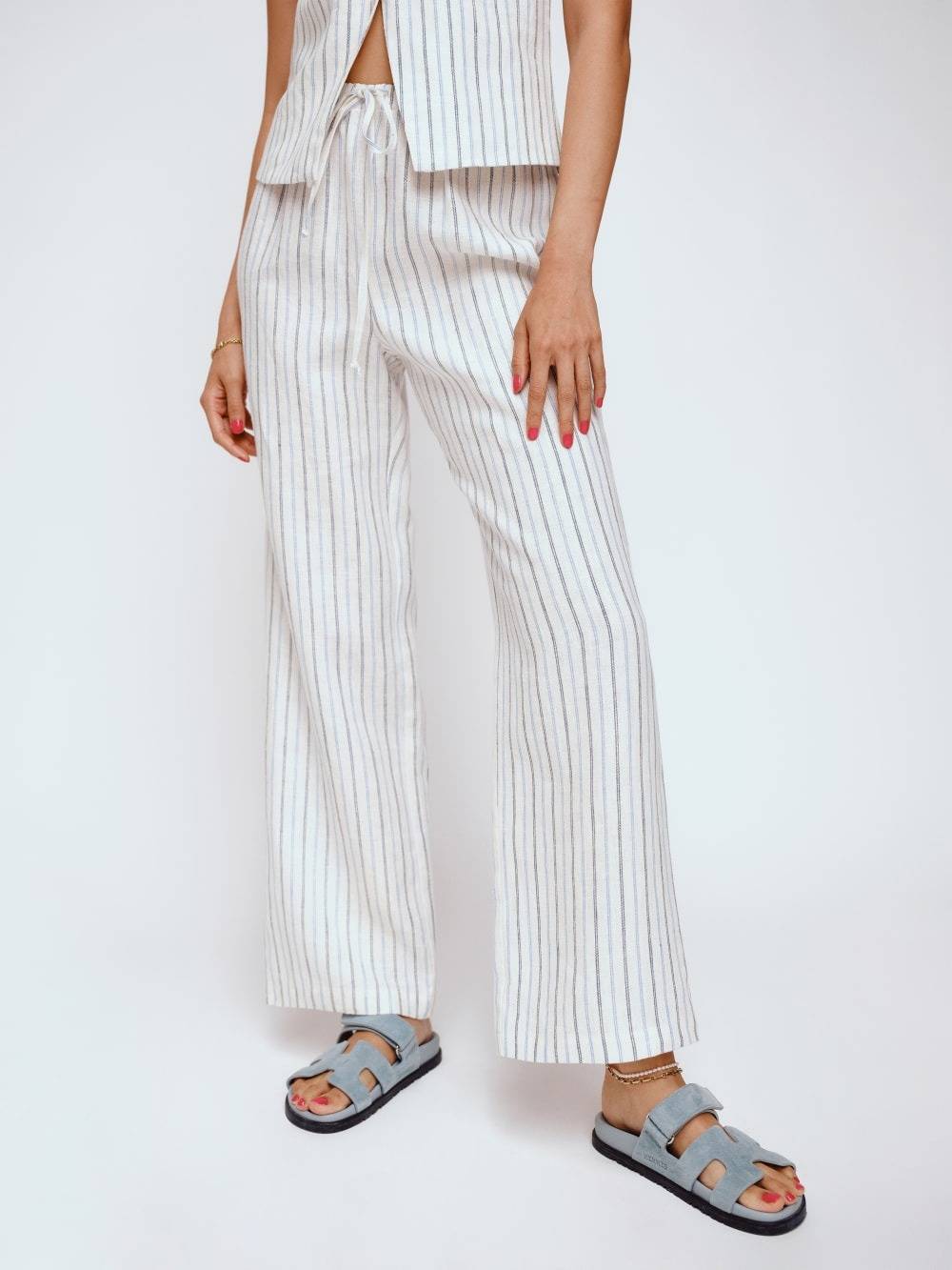 Сочетать пижамные штаны в полоску можно с базовыми предметами гардероба, такими как блейзеры оверсайз, свитера, кардиганы и футболки. Дополнят лук удобные кроссовки, мюли или же балетки.