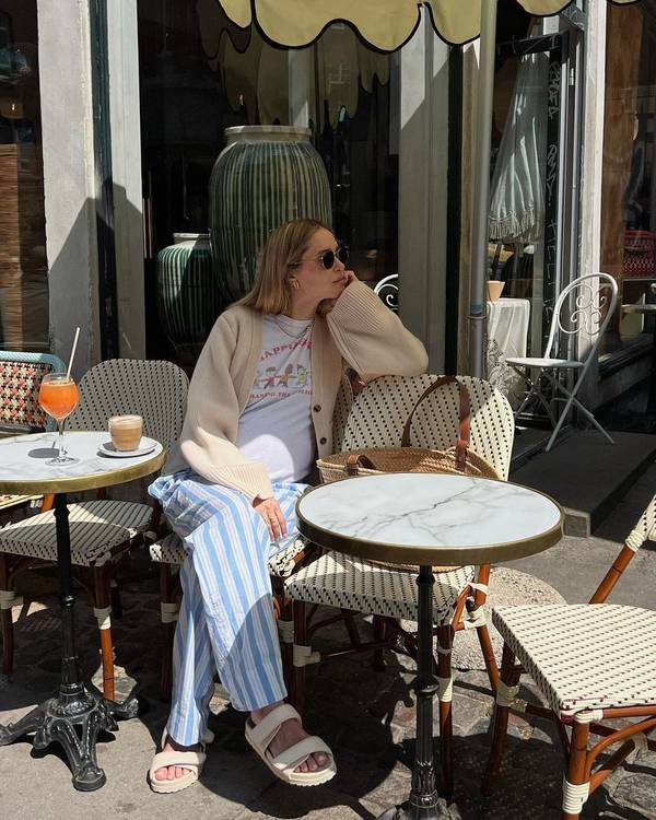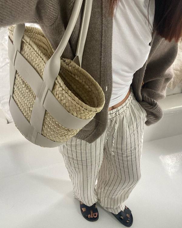 В прохладные летние дни поверх топа или футболки и пижамных брюк в полоску можно накинуть вязаный кардиган. А дополнят лук удобные босоножки на плоском ходу и плетеная сумка-шопер из лозы.