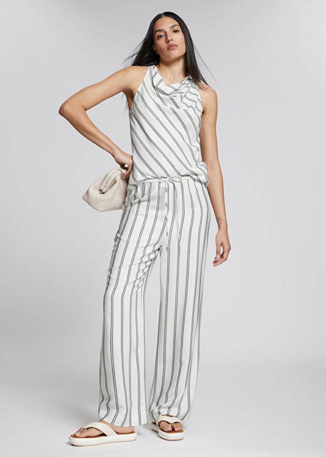 Можно подобрать необычные пижамные штаны со штанинами из разных тканей – однотонной и в полоску. Дополните их топом, пиджаком свободного кроя, плетеной сумкой-шопером, а также босоножками на плоской подошве, массивным украшением на шее и солнцезащитными очками.