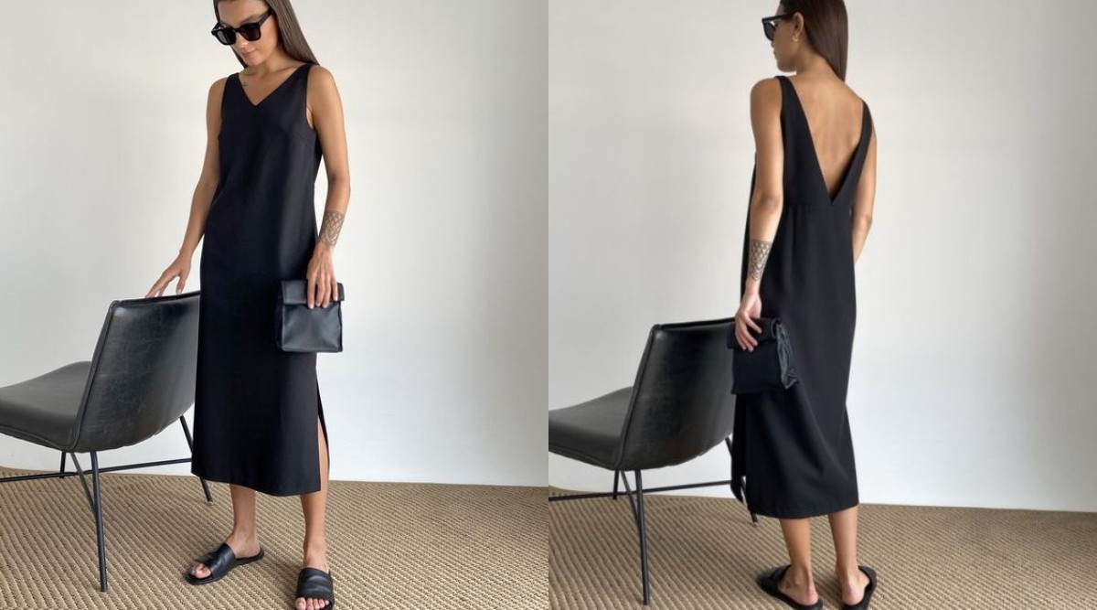Также можно присмотреть платье в длине миди с V-образным вырезом спереди и сзади. Завершат образ кожаные шлепанцы и вместительная сумка-кошелек.