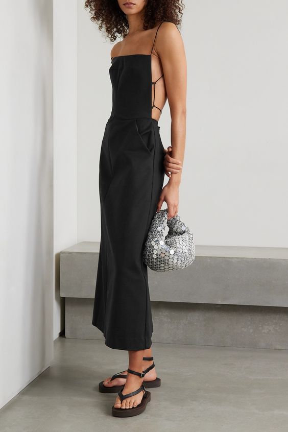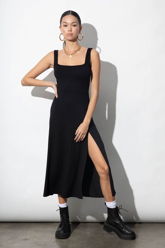 Чтобы создать небанальный образ, присмотрите черное платье свободного кроя в длине миди на широких бретельках и с разрезом спереди. Можно дополнить образ грубыми ботинками-"мартинсами" и массивной бижутерией – так вы точно будете выделяться из толпы.