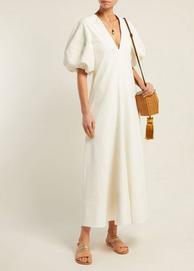 Еще один вариант – платье с широкими или объемными рукавами. Оно может быть как прямого кроя, так и приталенное. Дополните образ плетеной сумкой и босоножками на низком ходу.