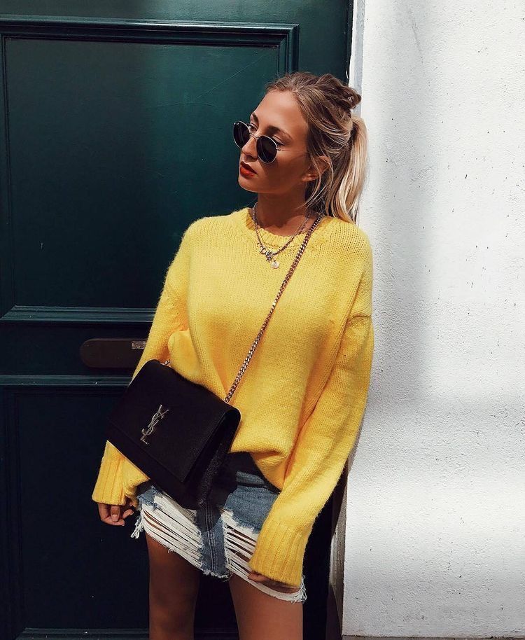 Желтый свитер - настоящий модный хит этой осени. Его можно носить с джинсами, деловыми брюками или юбкой-карандаш. Дополнить образ можно яркой помадой и контрастными аксессуарами.
