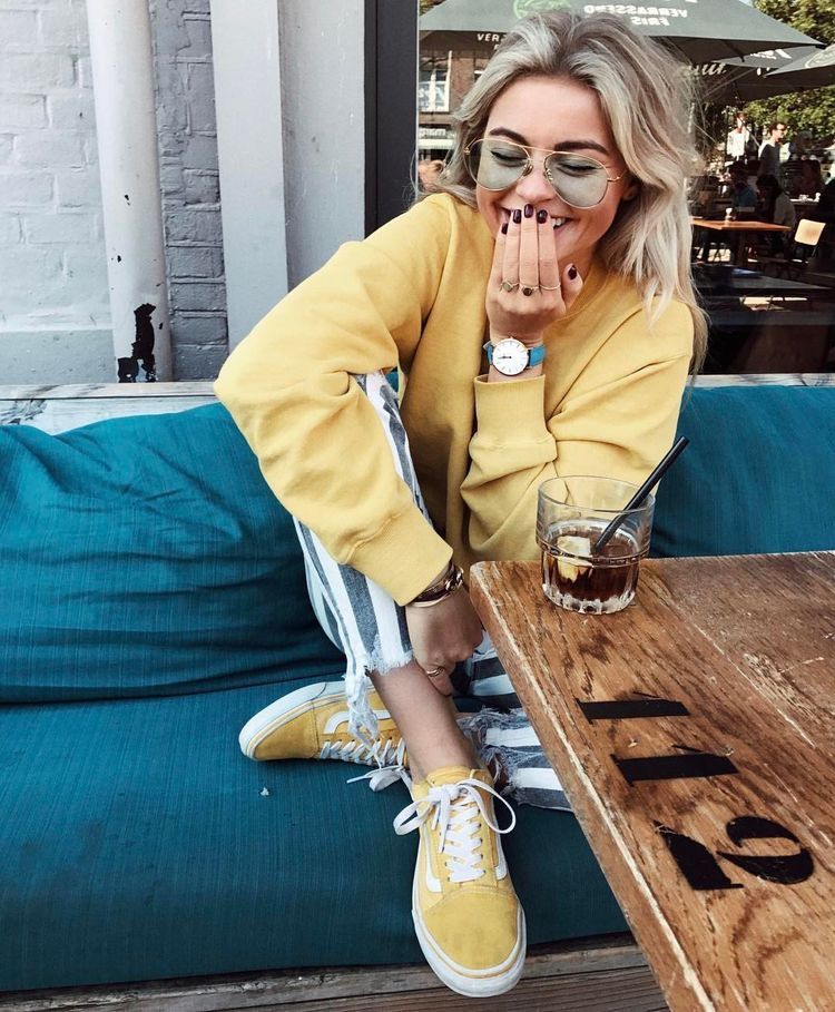 Очень уютный вариант для осени - худи или свитшот бананового цвета. Такой элемент образа сразу создает теплое и приятное настроение, просто идеальное для чаепития или прогулки.