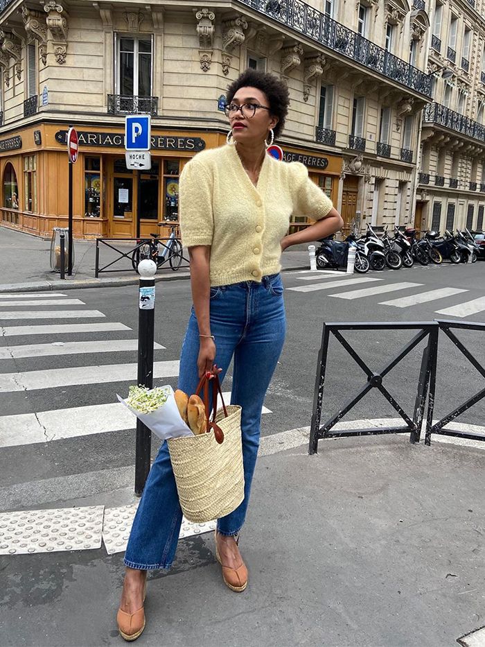 Беспроигрышный вариант для осенней прогулки - светло-желтый мягкий свитер, модные высокие джинсы из классического синего денима и туфли на небольшом каблуке или платформе.