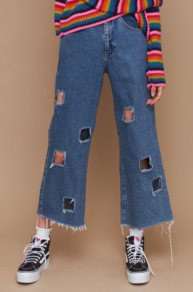 Оригинальный тренд - джинсы с фигурными вырезами. Их можно носить с яркими кофтами, чтобы создать образ в стиле хиппи. Или же надеть с рубашкой и лодочками, чтобы получился необычный строгий наряд с интересной изюминкой.