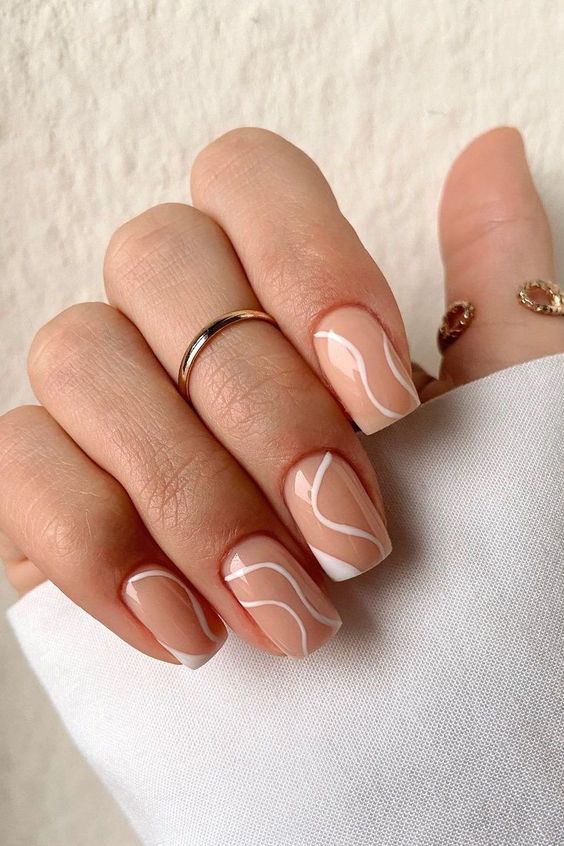 На длинных ногтях красиво будет выглядеть маникюр с волнистыми линиями. Дополнить такой дизайн можно небольшими бусинами возле основания ногтя.