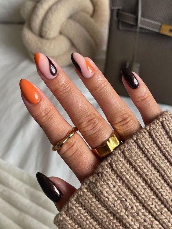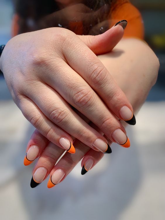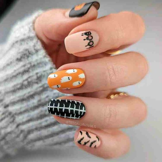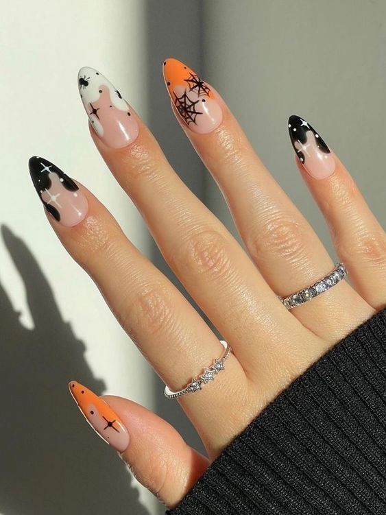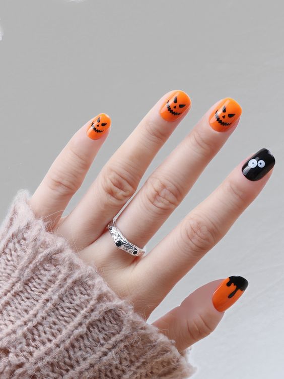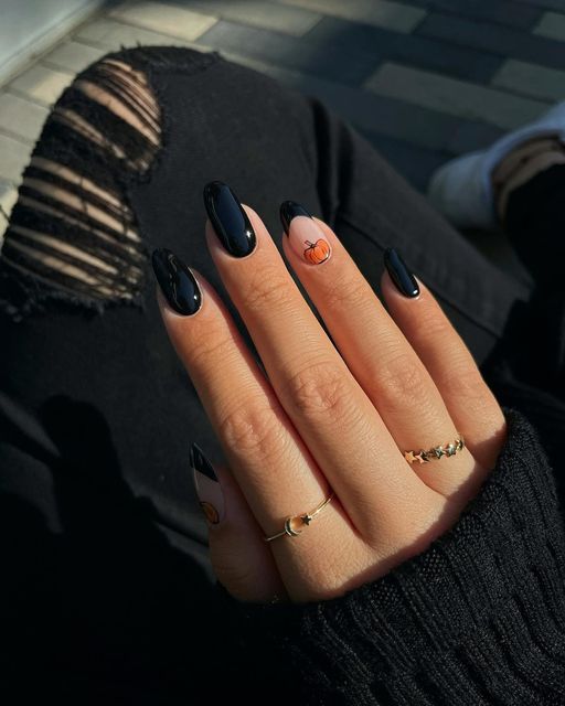 Традиционные цвета Хэллоуина – это, конечно же, оранжевый и черный. Их можно скомбинировать в одном маникюре в хаотическом порядке, сделать разноцветный френч или же дополнить покрытие рисунками паутины, пауков и других тематических персонажей.