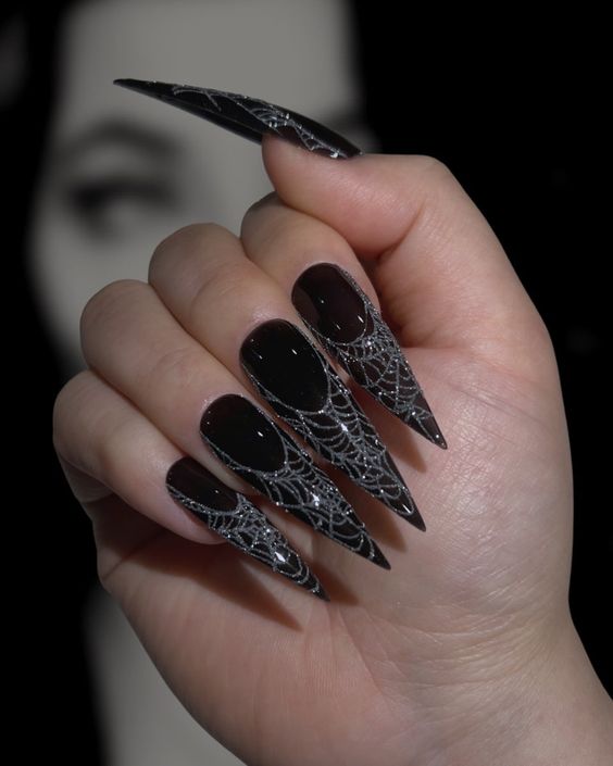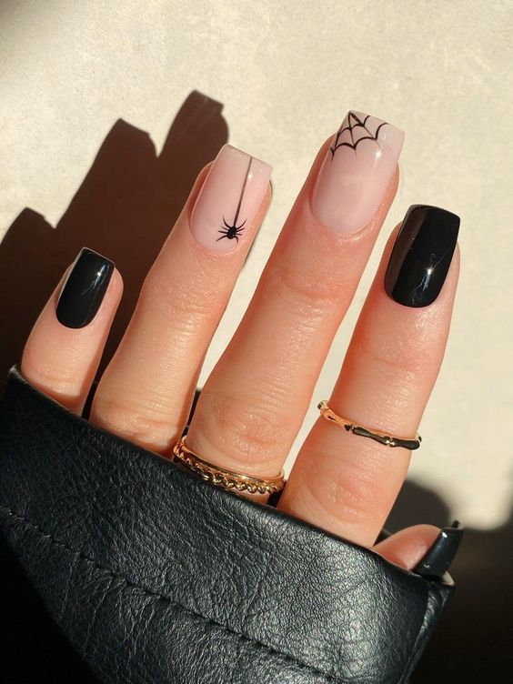 На длинных ногтях красиво будет смотреться однотонное черное покрытие. Для разнообразия один или несколько ноготков оставляем нейтрального оттенка и рисуем на них паутину, зомби, скелетов, вампиров и прочих страшных созданий.