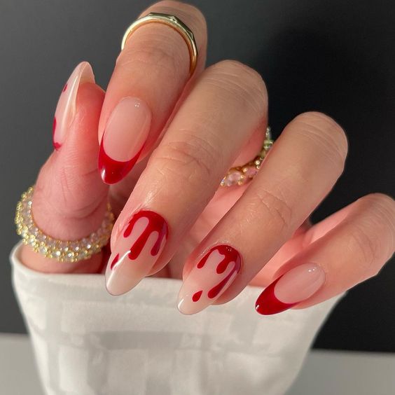 Также на полупрозрачных ногтях можно сделать оригинальные кровоподтеки ярко-красным гель-лаком.