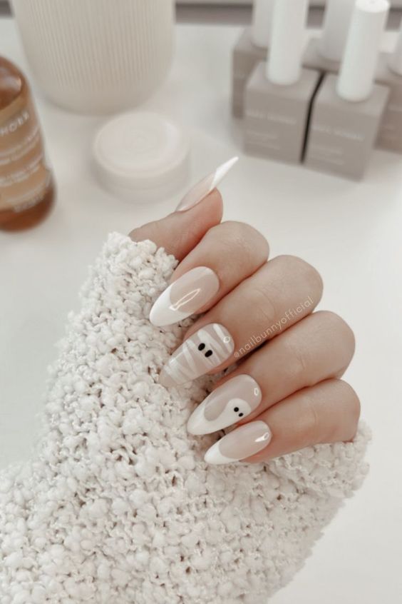 Еще один вариант маникюра на Хэллоуин – в белом оттенке. Это может быть оригинальный вариант французского маникюра.