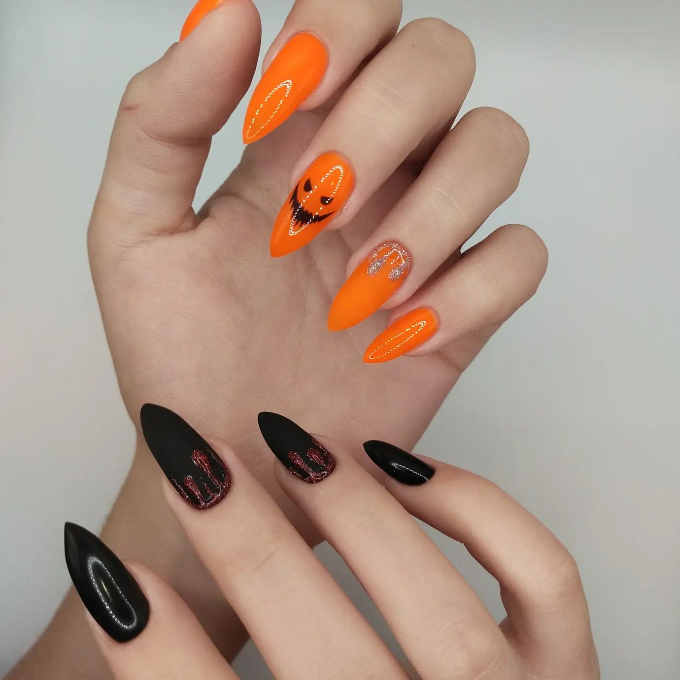 Еще один вариант – покрываем ногти на одной руке черным лаком, а на второй – оранжевым. На черном фоне можно сделать "кровавые подтеки" лаком с мелкими блестками, а на оранжевом будут красиво выглядеть черные рисунки, надписи и наклейки с тематикой праздника.