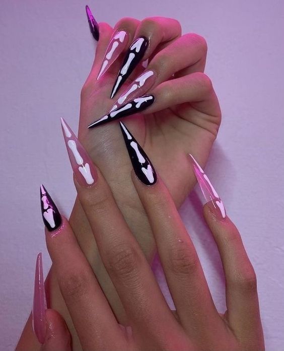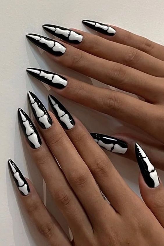 А на очень длинных ногтях можно изобразить дизайн, имитирующий кости скелета.