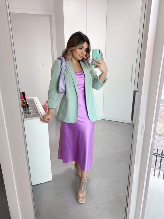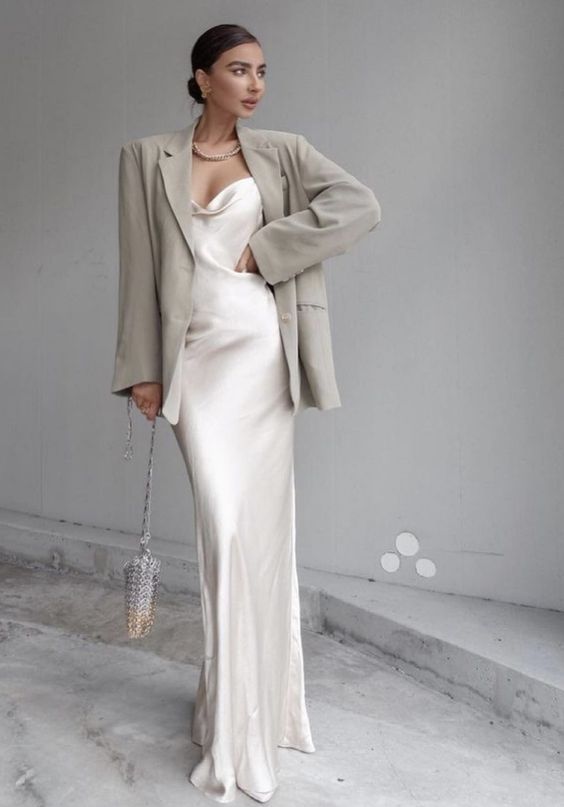 Также трендовое платье-комбинация хорошо сочетается с пиджаком оверсайз. Вы можете выбрать модель такого же цвета или же контрастного. Дополните образ стильными аксессуарами и открытой обувью.