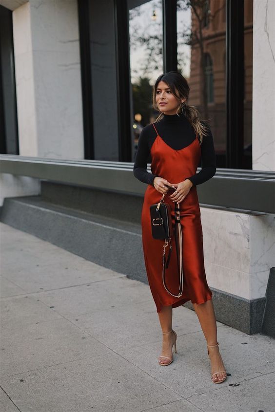 Еще один вариант, как носить платье на выпускной, – надевайте под платье-комбинацию тонкую водолазку контрастного цвета. Дополните лук босоножками на высоких каблуках и сумкой-клатчем.