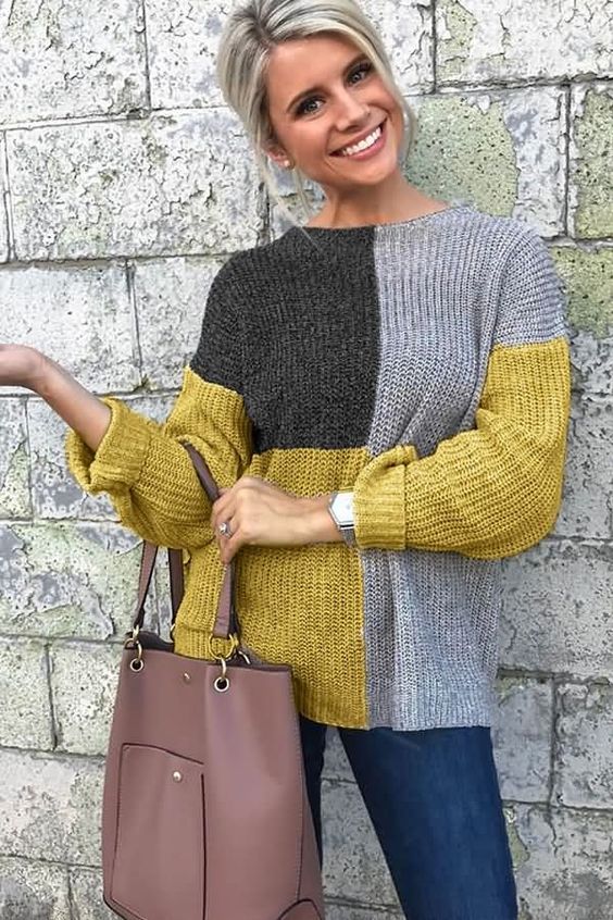 Свитер в желто-серой гамме может стать вашей любимой вещью. Его можно носить с любыми джинсами и обувью на массивной подошве.