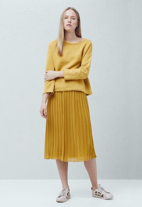 Также можно составитьtotal look в желтом – возьмите, например, юбку плиссе, которая сейчас находится на пике популярности, и к ней подберите желтый свитер. Дополнить образ можно как элегантными сапогами на каблуке, так и утепленными кроссовками.