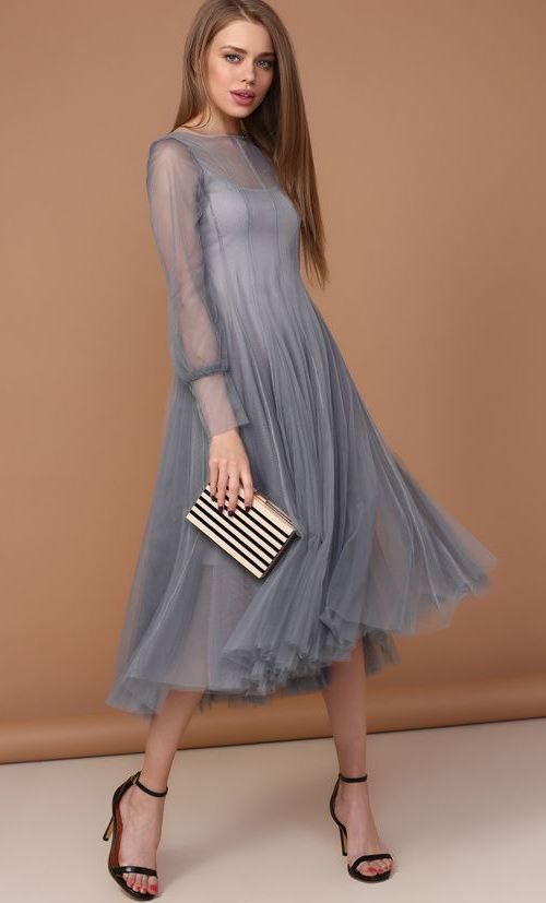 Так как следующий год – белого металлического Быка, вы можете выбрать серое платье в качестве новогоднего наряда. Платье с полупрозрачными рукавами будет эффектно подчеркивать стройные руки.
