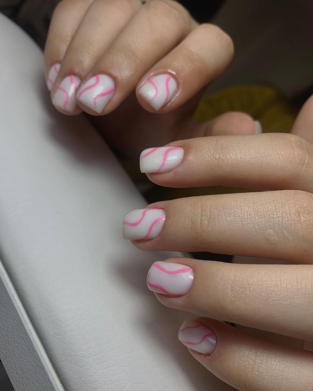 Еще один вариант для тех, кто не хочет маникюр с символикой Дня святого Валентина, - это волнистый маникюр. Наносим полупрозрачное бежевое или молочное покрытие, а сверху делаем линии розовым оттенком.
