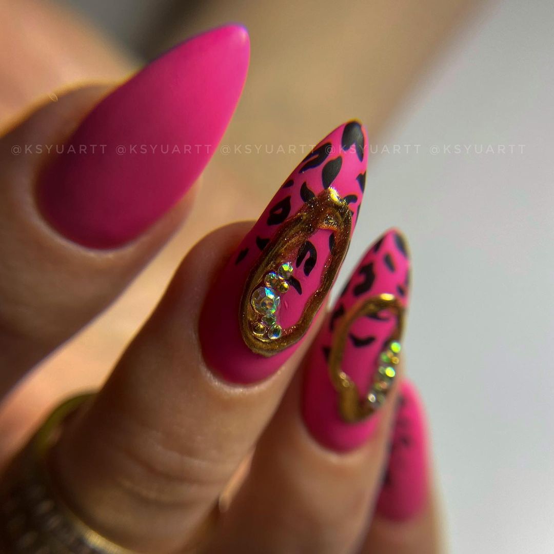 А тем модницам, которые хотят выделяться из толпы, советуем совместить в одном маникюре сразу несколько дизайнов. Покрываем ногти ярко-розовым оттенком (фуксия), делаем с помощью стемпинга тигровый маникюр, а сверху – объемную абстракцию с золотым лаком и камнями. Покрываем все матовым топом.
