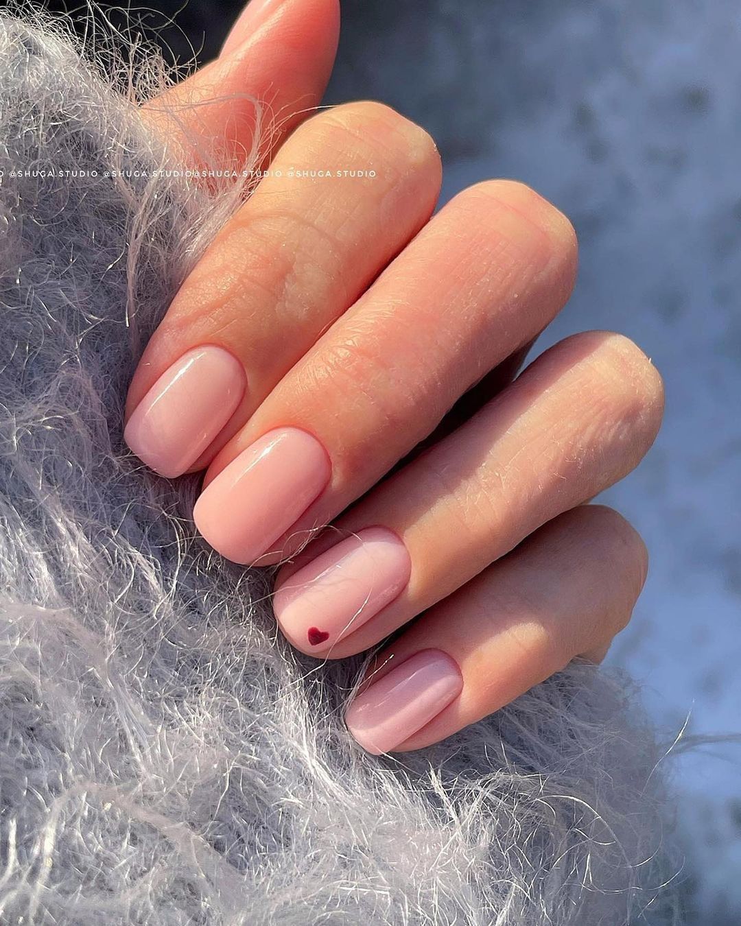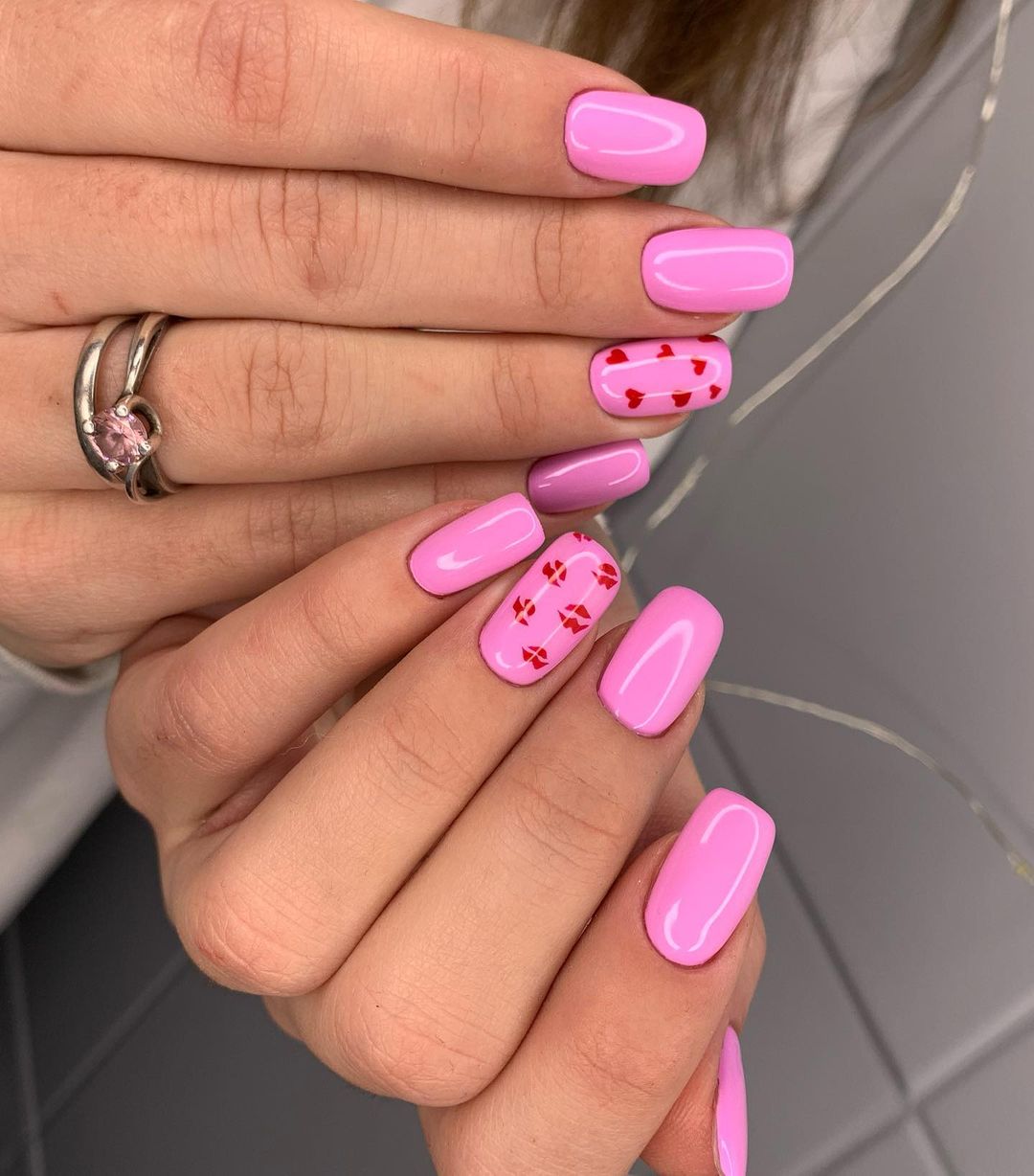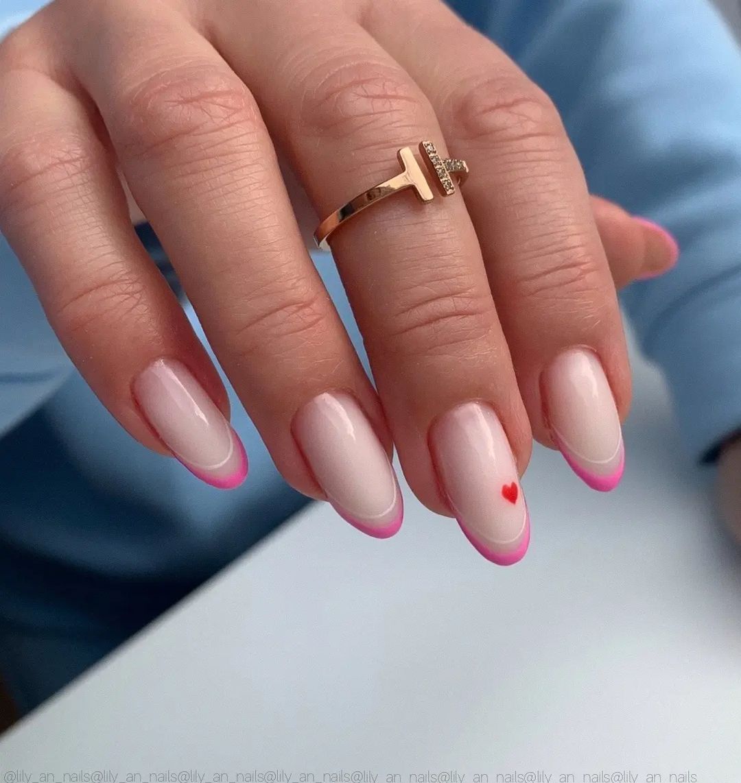 Если вы выбрали глянцевое покрытие, разнообразить розовый маникюр можно символикой Дня святого Валентина: небольшим сердечком на одном из ногтей.