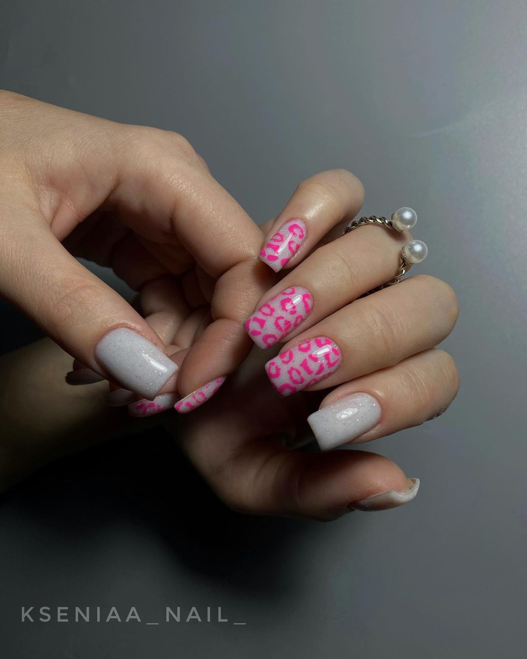 Также можно покрыть основную часть ногтя белым гель-лаком с шиммерными блестками, а сверху нанести розовым узор с помощью стемпинга или же нарисовать что-то.