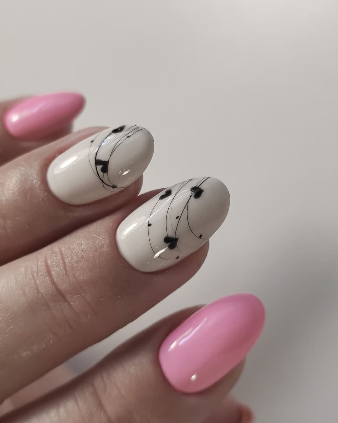 Еще одно стильное сочетание – розовый и белый. Дополнить такой дизайн можно контрастным стемпингом – то есть перенести рисунок с трафарета при помощи штампа, а также паутинкой.