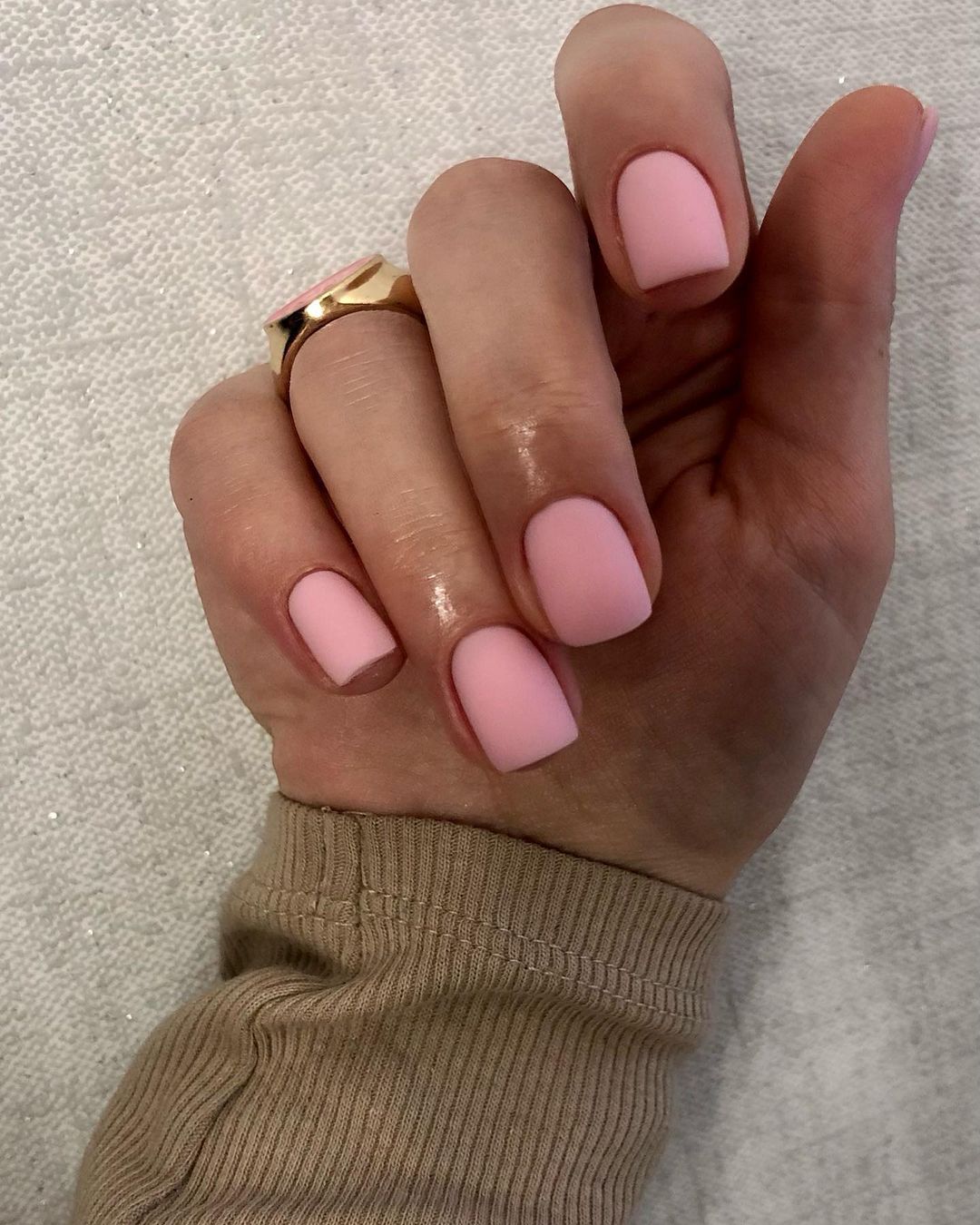 Для тех модниц, которые не любят вычурных дизайнов, советуем сделать однотонный матовый маникюр нежно-розового цвета. Такое покрытие будет красиво смотреться как на коротких, так и на длинных ногтях разной формы.
