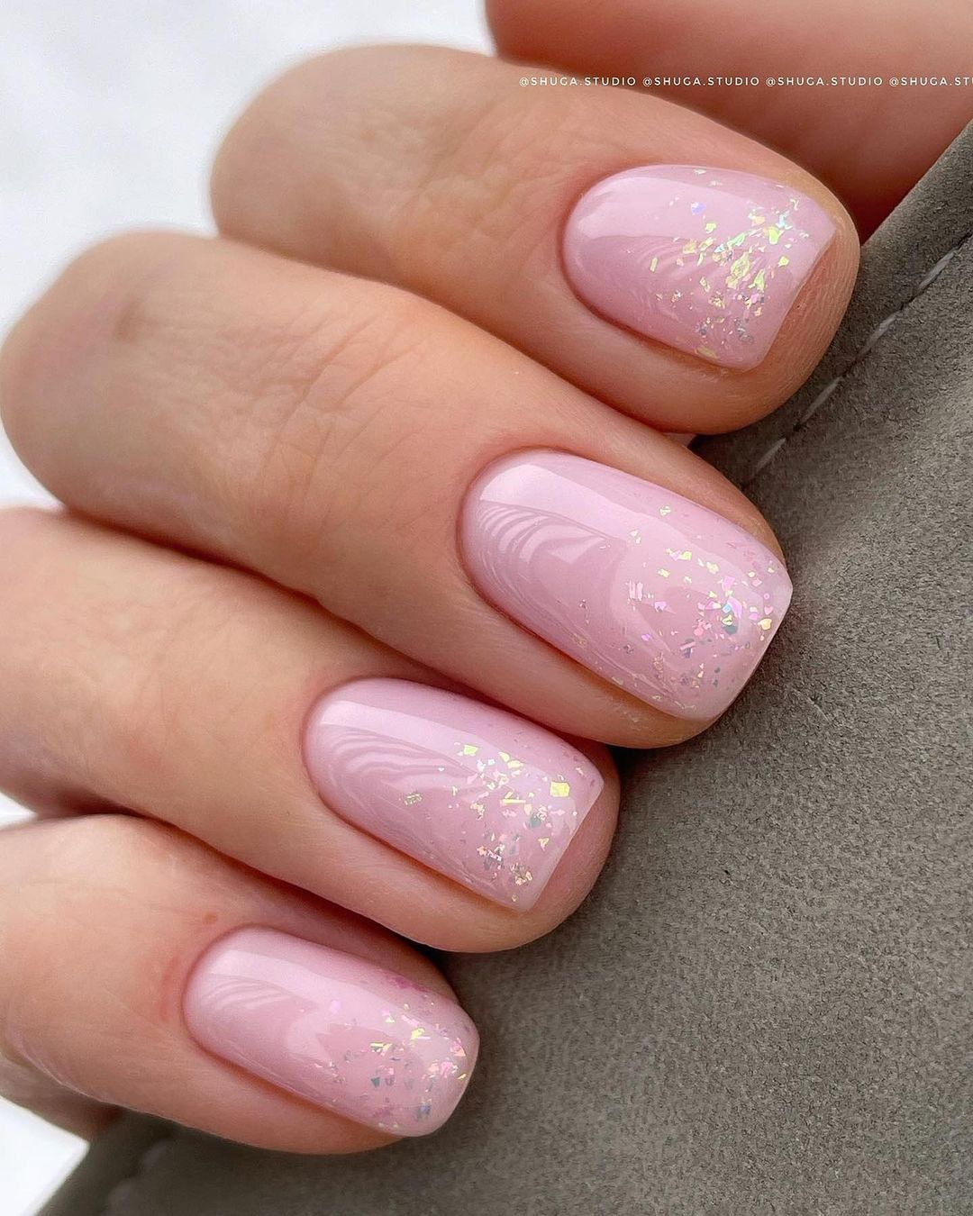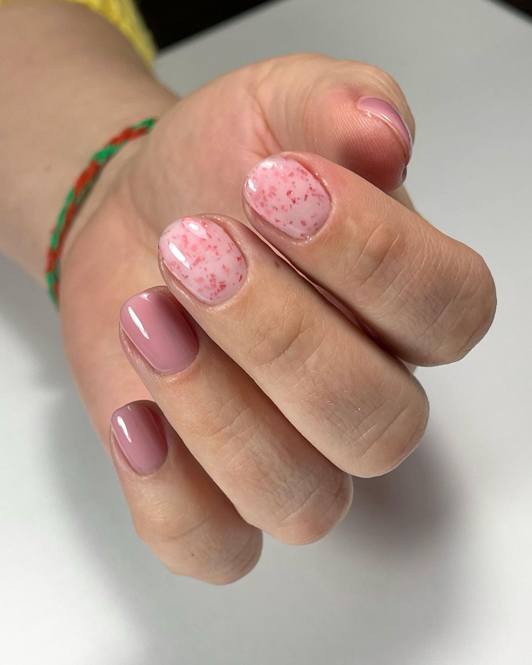 Еще один вариант – сделайте полупрозрачное розовое покрытие, а на кончик ногтя нанесите мелкие шиммерные блестки или частички фольги. Будет выглядеть очень женственно и стильно одновременно.