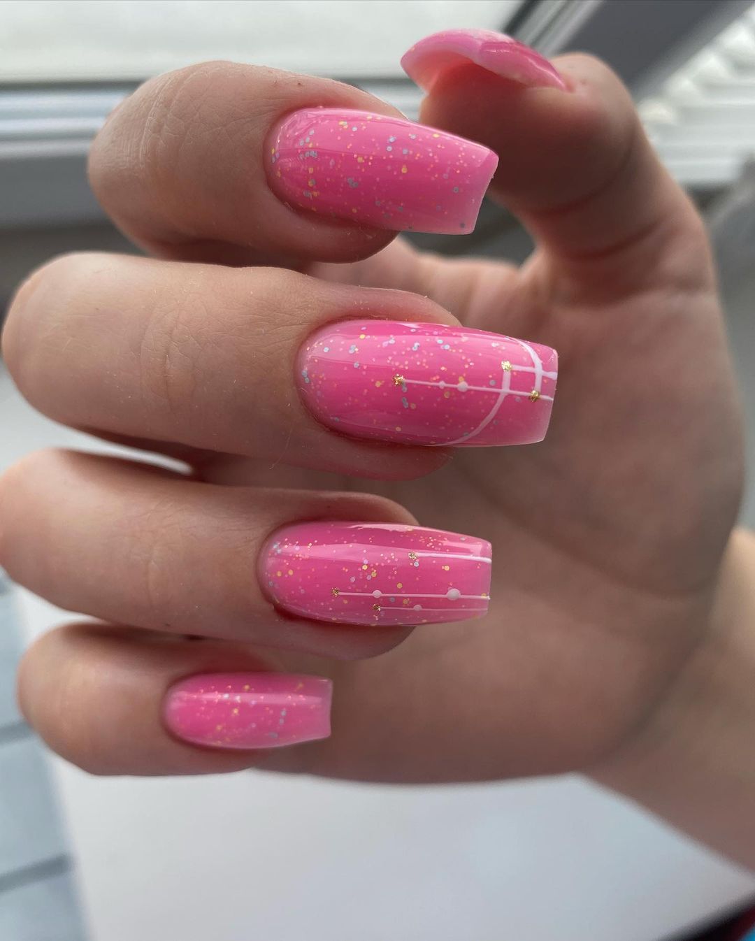 Если вам надоели нейтральные оттенки, обратите внимание на насыщенный розовый цвет. Дополнить такое покрытие можно блестками и геометрическими линиями контрастного цвета.