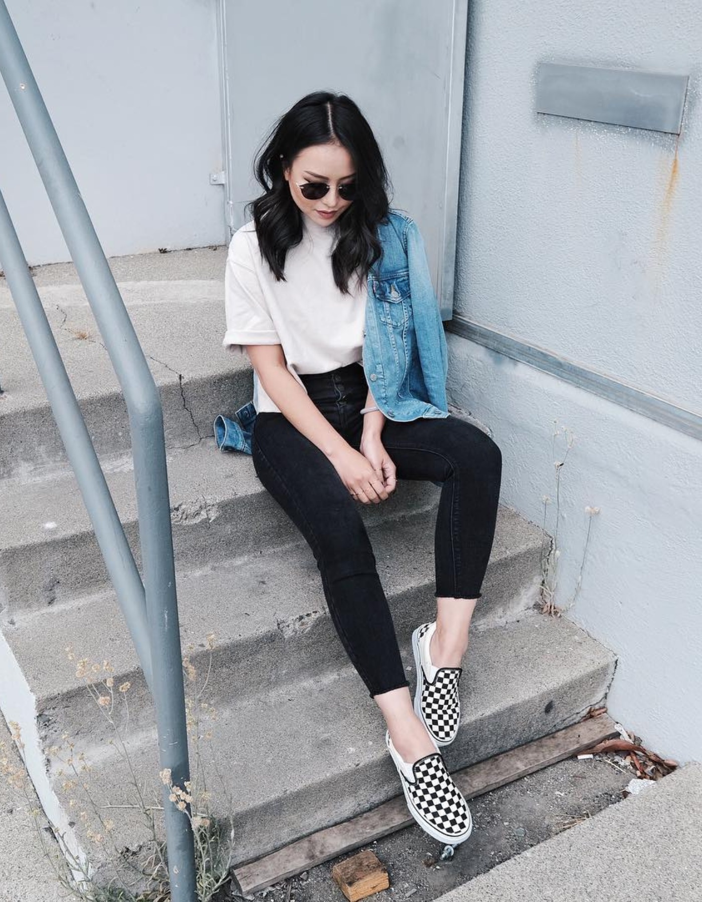 Сочетание черных джинсов скинни с джинсовой курткой – яркий пример простого классического образа. Чтобы выглядеть современно, подберите куртку в стиле оверсайз, а не приталенную. Это идеальный образ для прогулок в сочетании с кроссовками или для вечернего выхода в сочетании с обувью на каблуке.
