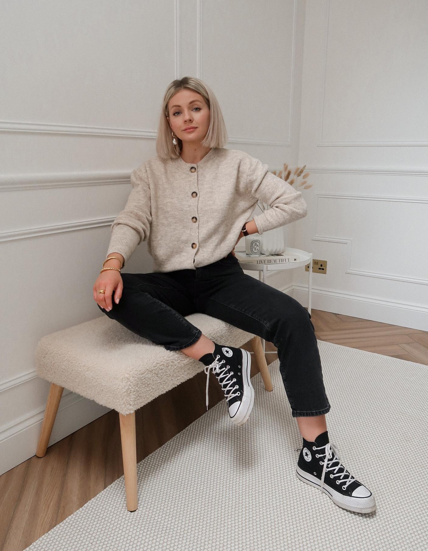 Для создания стильного повседневного образа надевайте черные джинсы скинни, бежевый кардиган на пуговицах, а также высокие кеды на резиновой подошве. Дополнят лук рюкзак или сумка-шопер.