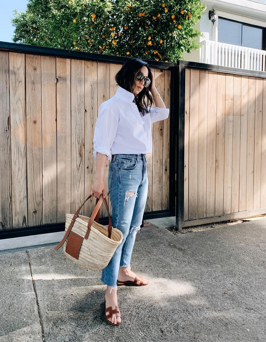 Классическая белая блузка – незаменимый вариант как для повседневных и деловых луков, так и для праздничных. Присмотрите такой образ: джинсы скинни голубого цвета с дырками и заправленная в них блузка. Дополните лук шлепанцами на низком ходу или в более прохладные дни ботильонами, а также плетеной сумкой-шопером из лозы.