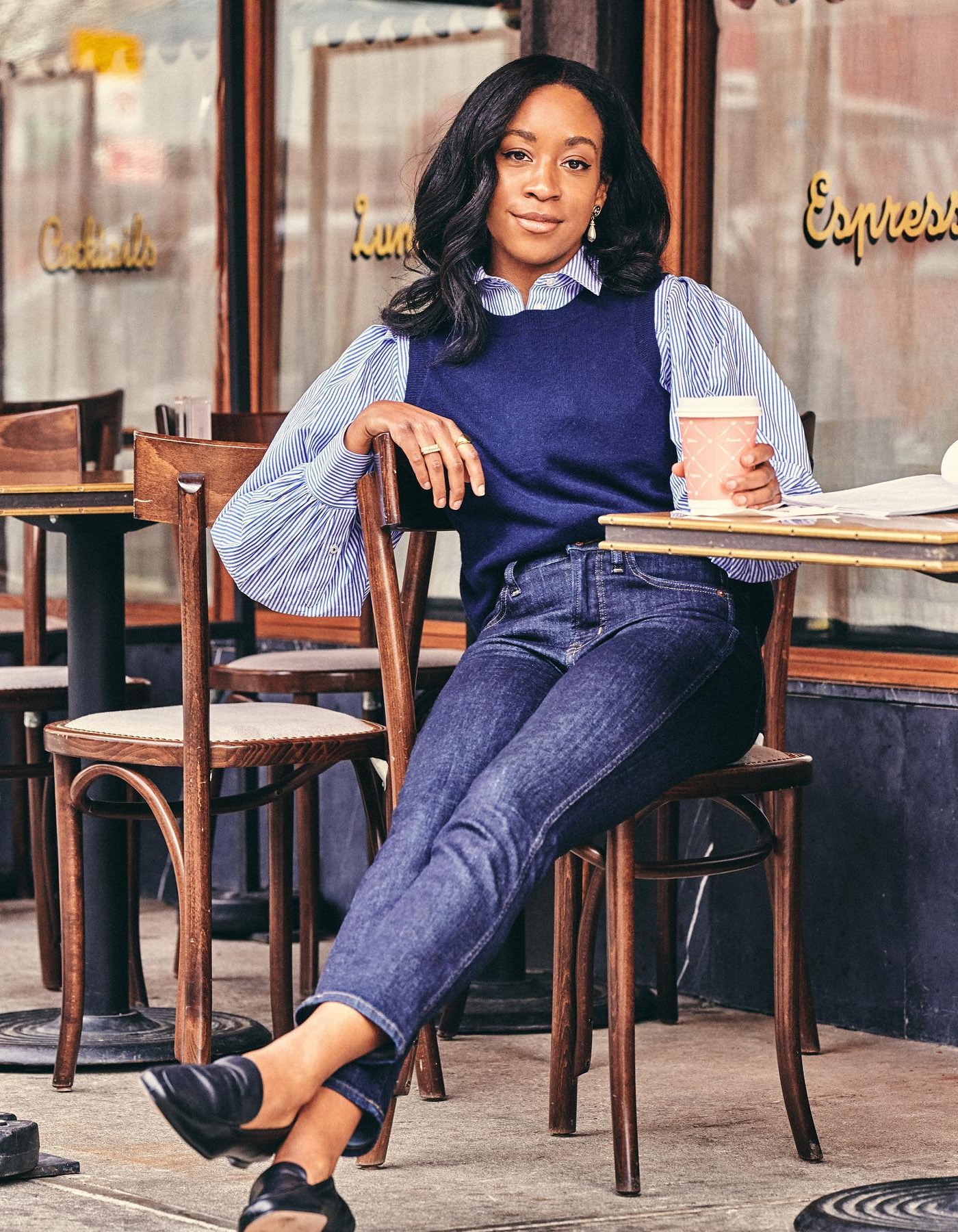 Как известно, туфли-лоферы сейчас находятся на пике популярности. Поэтому смело надевайте их с джинсами скинни, а также с блузой в полоску и трикотажным жилетом. В более прохладные осенние дни сверху можно накинуть тренч или пальто.