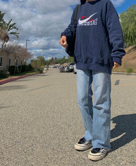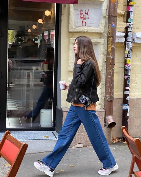 Джинсы такого фасона хорошо сочетаются с oversize свитшотом и спортивной обувью. Завершить образ можно классической косухой, которая уже не один сезон остается на пике популярности.